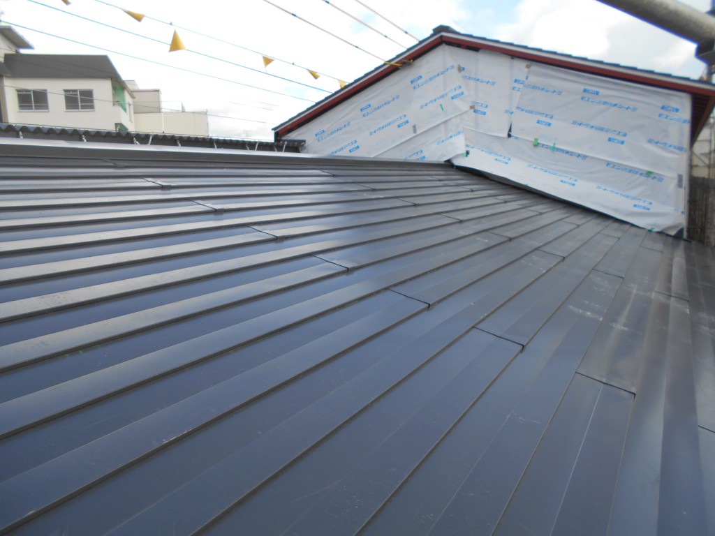 右の写真は波状鋼板屋根材の葺き上がりの写真です。