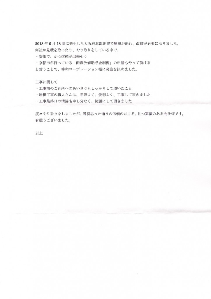 ・京都市が行っている「耐震改修助成金制度」の申請もやって頂けるということで、秀和コーポレーション様に発注を決めました。