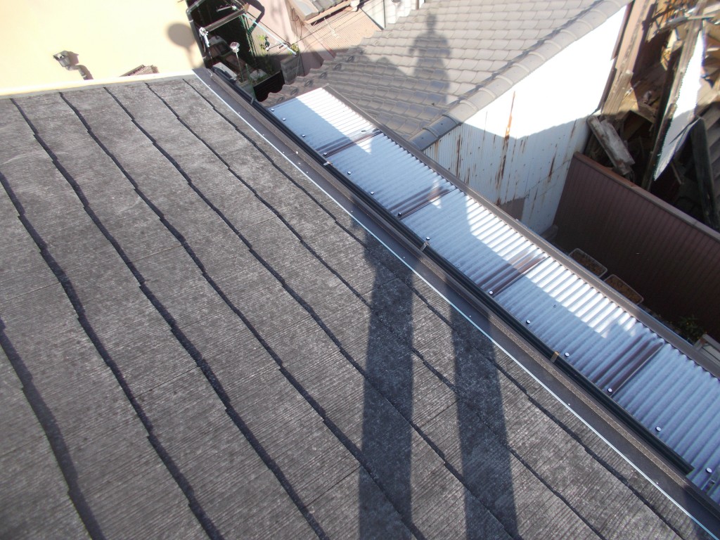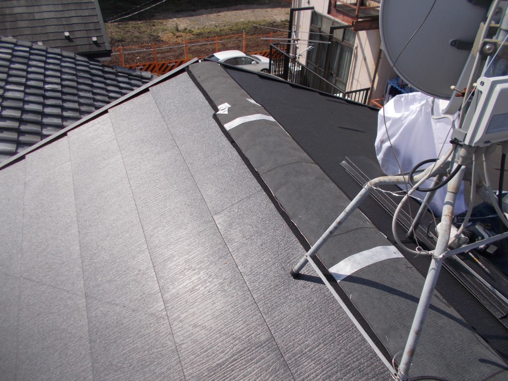薄物化粧スレート瓦(カラーベスト)の葺替え工事として近年ポピュラーな工法となりました既存屋根材を撤去せずに重ね葺く工法で、当社の一年間の屋根工事施工実績におきましても1、2の取扱い量となっております。
