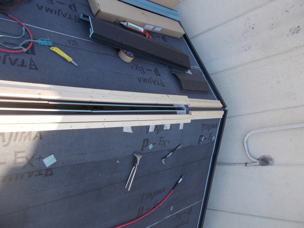 全体を防水シート(ゴムアスファルトルーフィング)で覆い、頂上部(棟部)に換気のための開口を設け漏水防止の水切りを取り付けます。