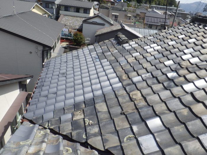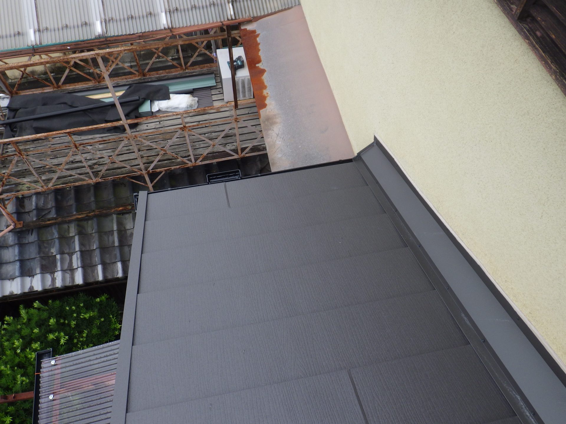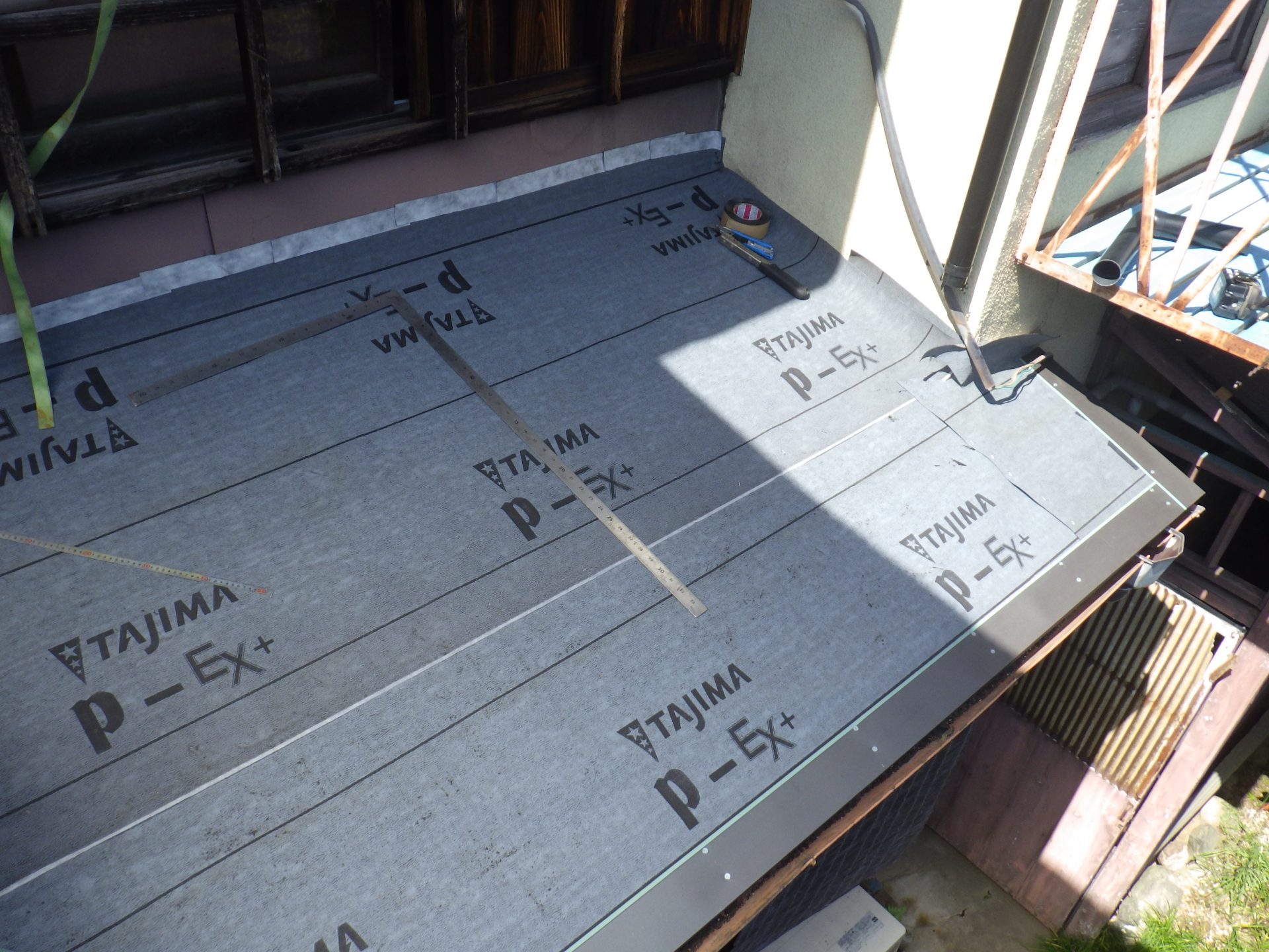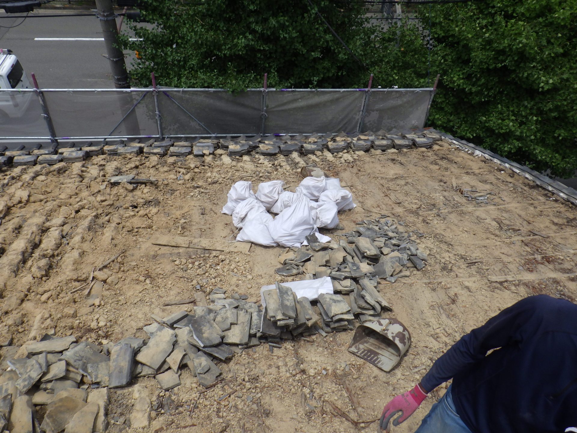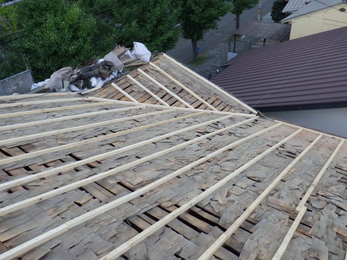 施工実績 上京区M様邸 屋根葺き替え工事 上京区にお住まいのM様より屋根からの雨漏りのご相談を受け、葺き替え工事をさせていただきました。 大きなお屋根の葺き替え工事をさせていただきました。傷むごとに部分的な葺き替えや瓦の差し替えなど、お手入れをしていただいていたようですが、葺き土の劣化、風化が激しくて瓦ズレも酷くいろんな所から雨漏りがしておりました。 また大量の瓦や葺き土による重量も建物に負担を強いているため地震に備える意味でも軽量な断熱材付き金属横葺材でのお葺き替えをご提案させていただきました。 面積が大きいため、瓦や土の除去だけでも数日掛かります。工事中の突然の降雨に備えて防水キャンバスシートを掛けながら瓦や土を屋根から降ろしていきます。 土の下には杉皮や薄い木片が敷かれてあります。これは今で言うところの防水シートに相当する下葺き材ですが劣化、風化によりボロボロとなり、雨漏りを防ぐことができません。 屋根の不陸を矯正するため既存の垂木の上に更に垂木を打ち付けます。こうすることで新設する野地板を強固に留め付ける事ができます。 野地板を垂木の上に固定していきます。12mm構造用合板を使用します。 野地板の上に改質ゴムアスファルトルーフィングを張ります。この二次防水が重要で、屋根材の耐候性や寿命年数などに目が行きがちですが高品質な防水下葺き材を使う事が実は屋根にとって大事なことと言えます。屋根材からの浸水は瓦の形状をしたものであれば重なり部からや嵌合式金属屋根材であれば継手や嵌合部などから浸水します。少量の浸水や結露水はこの二次防水で雨漏りを防ぎます。故にルーフィングの釘穴シール性や耐候性が重要になってくるわけです。現に過去に近畿地方を襲った大型台風がカラーベスト屋根を捲り上げる被害が相次ぎましたがルーフィングに損傷がなかったため雨漏り被害を免れたケースが沢山ありました。このことからもルーフィングの重要性がうかがえます。 屋根材はアイジー工業スーパーガルテクトを採用しました。この商品は性能に優れ、単なる屋根葺き替えにとどまらず屋根裏の断熱性を高めるリノベーションが期待できます。尚且つ軽量で災害に強く弊社では主力商品となっております。 大屋根の葺き替え工事が完成しました。色はチャコールグレーを採用しました。屋根には複数箇所に谷が有り、一部が寄棟になっております。既存野地は不陸が激しく、垂木の下に調整材を入れて水平構面を確保する事に苦労しましたが、横葺屋根の特徴である見付のラインが真っ直ぐに通っており仕上りにはとても満足しております。 大屋根の工事を終えた後、正面玄関上の屋根の工事に取り掛かります。こちらは屋根勾配の関係上、嵌合式縦葺き屋根材で施工していきます。屋根材にはその種類ごとに適応勾配が設定されています。例えばスーパーガルテクトを二寸五分勾配以下で使用すると嵌合部より雨水が逆流(毛細管現象に近い)現象が起きて、雨漏りする事があります。縦葺き材ですと一寸五分勾配でも対応出来ます。このように適材適所で材料を選定して工事を進めていきます。 建物の裏側にも下屋根が有り、そこも嵌合式縦葺き屋根材を施工しました。 全ての屋根葺き替え工事が完了しました。瓦屋根の雨漏りでお困りになられていたお施主様も仕上りにはとてもご満足いただけました。弊社としましては工事をお任せいただけた事に感謝しています。M様 誠にありがとうございました。 助成金について 前の記事 K様邸 屋根葺替え工事に 次の記事