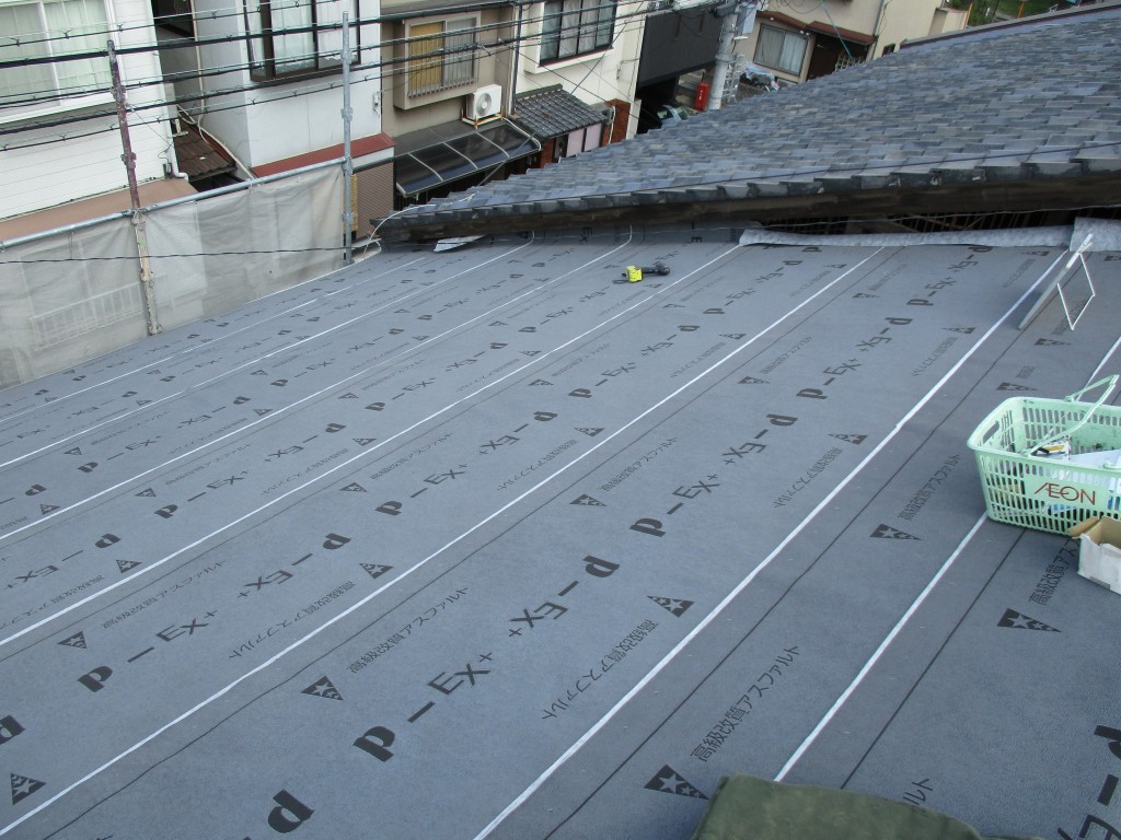 ゴムアスファルトルーフィングと言う下葺き材を敷きます。