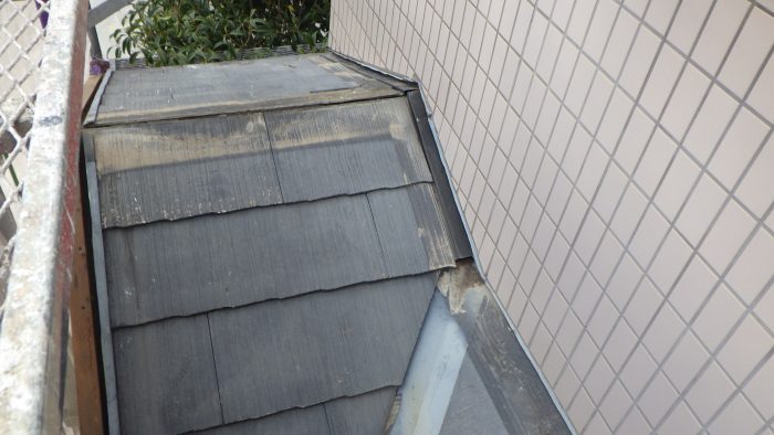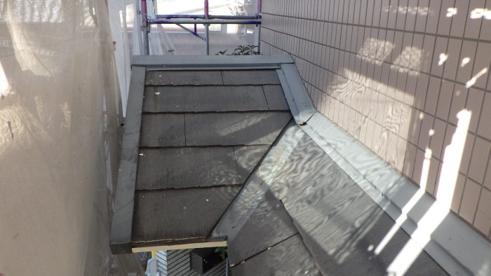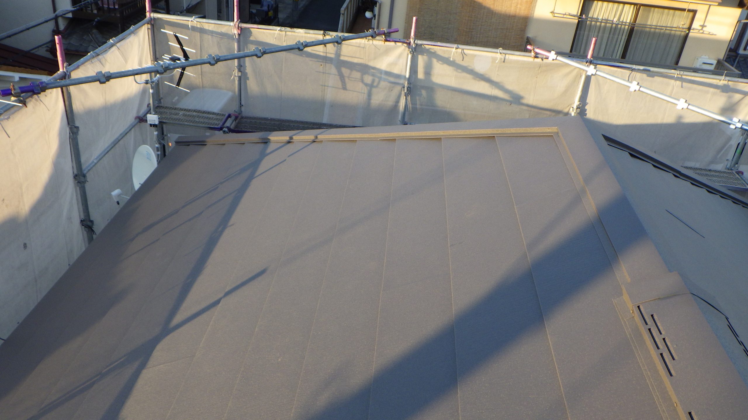 施工実績 城陽市 T様邸 外装改修工事 城陽市にお住まいのT様邸で、外装改修工事をお任せいただきました。 今回の工事では、既存スレート化粧板屋根のカバー工法による葺き替えと外壁塗装工事をメインに改修工事を行いました。 特に正面妻側の破風板や軒天、周辺のケイカル板張りの損傷や汚れが著しいため張替えを行なった後、外壁と同色で塗替えをさせていただきました。 大屋根の北面はやはり日当りが悪いのか、既存スレート化粧板の表面に苔や藻状のものが乾燥した状態で張り付いています。但し雨漏りなどはしておらず、野地板の状態は健全でビスによる保持力も充分に期待できるためアイジー工業のスーパーガルテクトでカバー工法を行います。 カバー工法にて不要となる既存棟板金と木下地を撤去します。 改質ゴムアスファルトルーフィングを敷き込みます。 板金役物を取り付け、棟木をルーフィングで巻き込みます。 本体を葺き上げていき、換気棟の開口を設けて捨て水切りを取り付けます。 棟木を取り付けて、防水シートで巻き込み、本体を棟際まで葺き上げます。 開口部の防水シートを切り取り、換気棟の水切りを取り付けます。最後に換気棟カバーを取り付け、棟工事を終えます。 大屋根の葺き替え工事が完了しました。 正面にある下屋根の葺き替え工事に取り掛かります。大屋根同様に、不要になる板金や木下地を撤去します。 ゴムアスファルトルーフィングを敷き込み、役物を取り付けた後、スーパーガルテクトを葺いていきます。 下屋根の葺き替え工事も完了しました。 屋根工事が終われば塗装工事に取り掛かります。但し軒天や破風板、また壁の一部のケイカル板の損傷が激しく、このまま塗装という訳には参りません。幸い下地はダメージが無かったため、ケイカル板を増し張りします。 ケイカル板を張り終えたら継ぎ目等にシーリングを打ち、塗装をしていきます。ケイカル板は水に浸食されるとボロボロになってしまいます。工事前に損傷が激しかった原因が、経年劣化というのもありますが、破風板に屋根置きTVアンテナがあり転倒防止のステンレス支線が破風板に打ち込まれていたため、雨水が伝い更に劣化を促していました。今回の工事ではアンテナを屋根から移動したため、劣化リスクを軽減出来ました。また塗料の色を壁と同色にしたので、建物に落ち着いた印象を与えています。 工事が終わりました。足場を解体して、全景をT様にご確認いただき、喜んで頂きました。ベージュを基調とした外壁は、タイル面と調和がとれており、シックな外観に生まれ変わりました。T様、この度は工事をお任せいただき、誠にありがとうございました。 下京区 T様邸 外装改修工事 前の記事 【令和7年度】屋根の葺き替え工事は助成金が交付されます 次の記事
